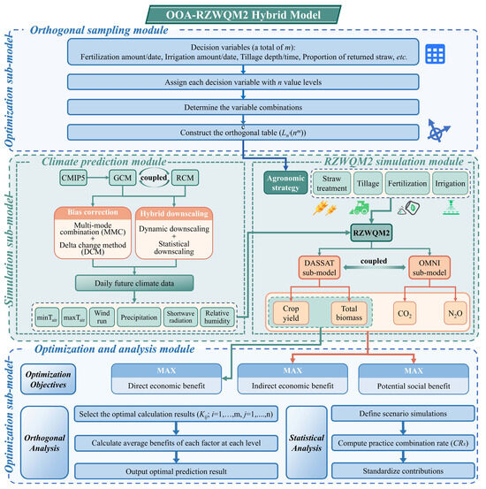 The present study sought to develop a simulation-optimization model with a deterministic sampling strategy, climate prediction, and crop growth simulation processes, i.e., OOA-RZWQM2 hybrid model. As shown in Figure 1, the simulation sub-model comprises a climate prediction module and an RZWQM2 simulation module. The climate prediction module generates high-resolution daily future climate data, serving as critical climate scenarios to drive simulations within the RZWQM2 simulation module. The RZWQM2 simulation module simulates agricultural management scenarios defined by the decision variables, generating the outputs required for objective function quantification: crop yield, total biomass, CO2 and N2O emissions. The optimization sub-model integrates an orthogonal sampling module with an optimization analysis module. The orthogonal sampling module performs deterministic sampling of the decision variables, which are subsequently employed in the simulation sub-model. Subsequently, the optimization analysis module constructs objective functions to identify BMPs. The decision variables are defined as a series of agronomic practices, e.g., fertilization amount and date, irrigation amount and date, tillage depth and time, and proportion of returned straw. The objective functions are direct economic benefits, indirect economic benefits, or potential social benefits, identifying future BMPs, and achieving a low-carbon economy by integrating simulation and optimization sub-models.