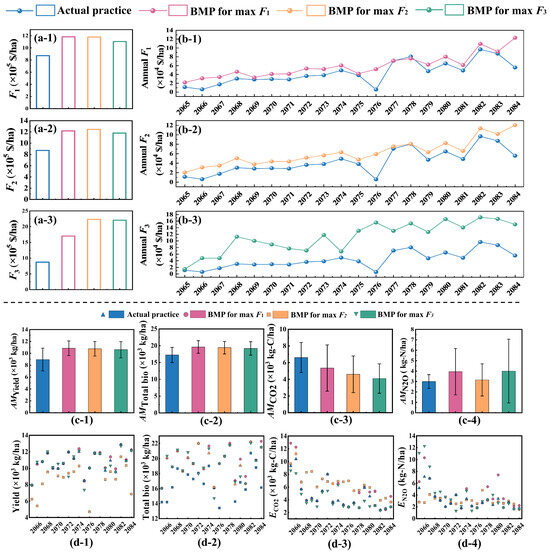 (a) Direct economic benefit, indirect economic benefit, and potential social benefit (F1, F2, and F3) under the actual practice, BMP for max F1, BMP for max F2, and BMP for max F3, respectively. (b) Maximum direct economic benefit, indirect economic benefit, and potential social benefit (max F1, max F2, and max F3) compared to the economic benefit under actual practice. (c) Annual mean values of yield (AMYield), total biomass (AMTotal bio), CO2 emissions (AMCO2), and N2O emissions (AMN2O) under the actual practice, BMP for max F1, BMP for max F2, and BMP for max F3 from 2065 to 2084. (d) Interannual yield, total biomass, CO2 emissions (ECO2), and N2O emissions (ECO2) from 2065 to 2084.