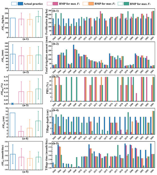 (a) Annual mean values of fertilization (AMFA), irrigation (AMIA), proportion of returned straw (AMPRS), tillage depth (AMTD), and tillage time (AMTT) under the actual practice, BMP for max F1, BMP for max F2, and BMP for max F3 from 2065 to 2084, respectively. (b) Interannual fertilization, irrigation, proportion of returned straw (PRS), tillage depth, and tillage time from 2065 to 2084.