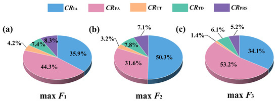 (a) The relative contribution rates of irrigation (CRIA), fertilization (CRFA), tillage depth (CRTD), tillage time (CRTT), and proportion of returned straw (CRPRS) on maximum direct economic benefit (max F1). (b) The relative contribution rates of CRIA, CRFA, CRTD, CRTT, and CRPRS on maximum indirect economic benefit (max F2). (c) The relative contribution rates of CRIA, CRFA, CRTD, CRTT, and CRPRS on maximum potential social benefit (max F3).