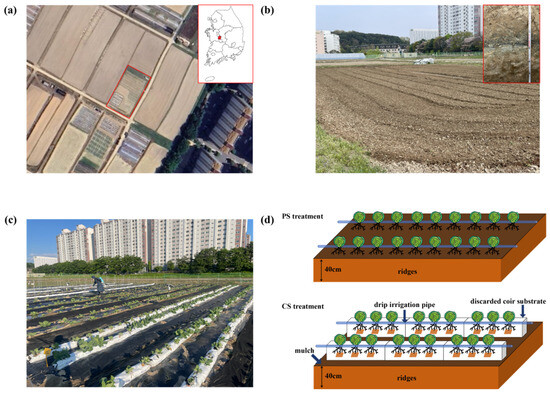 To evaluate the feasibility of reusing discarded coir substrate in paddy-converted fields, the main plot included two growth substrates: (1) Paddy soil (PS) treatment, consisting of paddy soil that was only plowed and fertilized after rice harvest, without drainage pipe installation; (2) Coir substrate (CS) treatment, consisting of discarded CS slab (100 × 20 × 10 cm; L × W × H, Daeyoung GS Co., Ltd., Daegu, Republic of Korea) that had been used for one year in hydroponic bell pepper cultivation. The substrates were then recycled and applied to the ridges for planting. The detailed cultivation method and treatment of the discarded coir substrate were described in our previous study [10]. The experimental field soil had been used for two years in upland crop planting experiments with discarded coir substrates, with only tillage and base fertilizer applied (Figure 1c,d). In order to apply the base fertilizer appropriately, paddy soil and discarded coir substrate samples were collected before the experiment and sent to the Daejeon Agricultural Technology Center for physical and chemical property analysis (Table 1 and Table 2). Based on the fertilizer formula provided by the Daejeon Agricultural Technology Center, a base fertilizer containing 129 kg∙ha−1 of nitrogen (N), 304 kg∙ha−1 of phosphorus (P2O5), and 114 kg∙ha−1 of potassium (K2O) was applied. Pest and disease management during the trial followed the cultivation standards provided by Asia Seed Co., Ltd., Seoul, Republic of Korea [36].