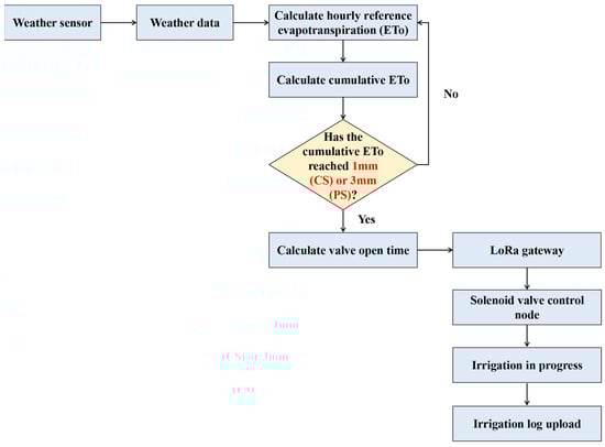 The irrigation algorithm used in this study proposed an automated control method based on cumulative ET0. First, the weather sensor collected field environmental data every 3 min and used the hourly average data to calculate the hourly ET0. Subsequently, the system accumulated the hourly ET0 values and determined whether they exceeded a preset threshold. If the accumulated ET0 reached the set threshold, the solenoid valve opening duration was calculated, and a command was sent through the LoRa gateway to trigger irrigation. During the irrigation process, the irrigation records were uploaded to the database to support data analysis and system optimization.