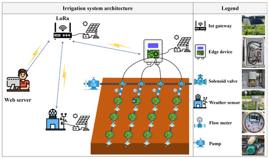 Figure 3 illustrates the overall architecture of the irrigation system. The system consists of an IoT gateway, edge devices, irrigation components (including solenoid valves, flow meters, and a pump), and a weather sensor. These units are interconnected via LoRa wireless communication technology, enabling data acquisition, transmission, and coordinated system control. The IoT gateway serves as the data hub of the system. It is responsible for receiving environmental parameters monitored by the weather sensor (WS500-UMB; Lufft, Fellbach, Germany) and the operational status of the irrigation solenoid valves (HPW2110A; HYOSHIN MECHATRONICS Co., Ltd., Bucheon-si, Republic of Korea) installed on-site. These data are then transmitted to the edge devices for processing. The edge devices are responsible for real-time processing of irrigation decisions based on the integrated automatic irrigation algorithm. All system units are powered by solar panels (KF20M-12; Kf solar Co., Ltd., Nanjing, China), and energy is stored in batteries (ATLASBX BXKB4.5–12; Hankook & Company Co., Ltd., Seongnam-si, Republic of Korea), ensuring stable operation of the system in the absence of an external power supply. This irrigation system can improve water use efficiency and reduce water waste by adopting precise irrigation with frequent, small irrigation amounts.