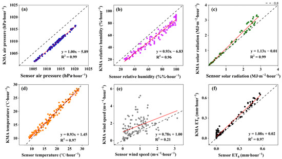 Pearson correlation analysis of hourly weather data from the Korea Meteorological Administration (KMA) and on-site sensors, from 11 to 15 April 2024. Red lines represent the regression lines. Air pressure (a); relative humidity (b); solar radiation (c); temperature (d); wind speed (e); reference evapotranspiration (ET0) (f).
