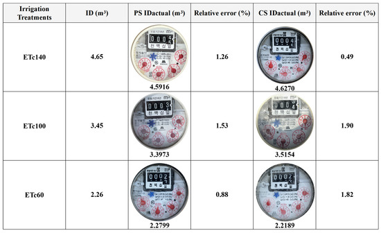 In addition, the accuracy of the automated irrigation system was assessed by comparing the ID (Table 4) with the actual total irrigation depth (IDactual) recorded by the flow meters. The flow meters (KTC 1-11-10; Korea Aichi Co., Ltd., Gimpo-si, Gyeonggi-do, Republic of Korea) recorded the irrigation depth for each treatment based on the monitored ETc values at the end of the experiment. No flow meter was installed for the ETc0 treatment, as irrigation was only applied during the root establishment period. Mechanical flow meters were used for monitoring, and their technical specifications and accuracy details are provided in Table 5. The actual flow rate for each treatment was 0.266 m3·h−1 (calculated based on a drip emitter flow rate of 2 L·h−1 and 133 plants per plot), which falls within the Q2–Q3 range, with a measurement accuracy of ±2.0%. The relative error was calculated according to Equation (4).