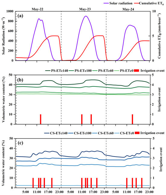 Soil moisture dynamics under different irrigation levels in coir substrates (CS) and paddy soil (PS) from 22 to 24 May 2024. Hourly solar radiation and cumulative reference evapotranspiration (ET0) (a); volumetric water content in paddy soil (PS) under four irrigation levels in response to irrigation events (b); volumetric water content in coir substrates (CS) under four irrigation levels in response to irrigation events (c). The treatments consisted of four irrigation depths based on: ETc140 (140% of ETc), ETc100 (100%), ETc60 (60%), and ETc0 (no irrigation control). Irrigation events are indicated by a value of 1 on the right Y-axis for visualization purposes only.