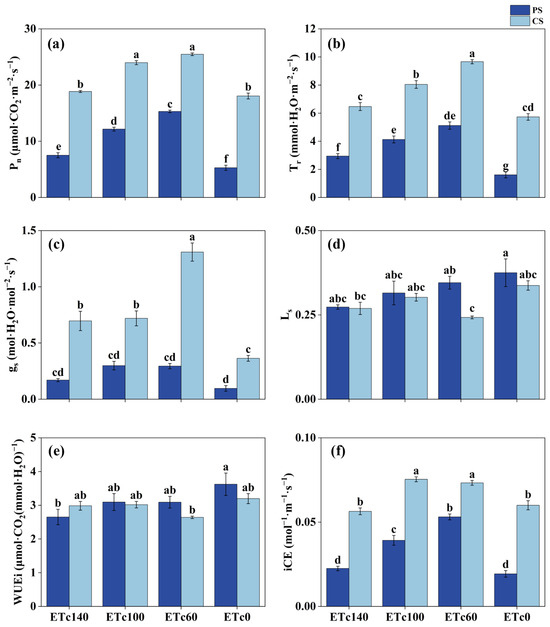 The photosynthesis characteristics of cabbage (Brassica oleracea var. capitata L.) under different irrigation levels in coir substrates (CS) and paddy soil (PS) during the head formation stage. Net photosynthetic rate (Pn) (a); transpiration rate (Tr) (b); stomatal conductance (gs) (c); stomatal limitation index (Ls) (d); instantaneous water use efficiency (WUEi) (e); instantaneous carboxylation efficiency (iCE) (f). The treatments consisted of four irrigation depths based on: ETc140 (140% of ETc), ETc100 (100%), ETc60 (60%), and ETc0 (no irrigation control). All data are expressed as mean ± standard error (n = 5). Different letters indicated significant differences (p < 0.05) according to Tukey’s multiple range test.