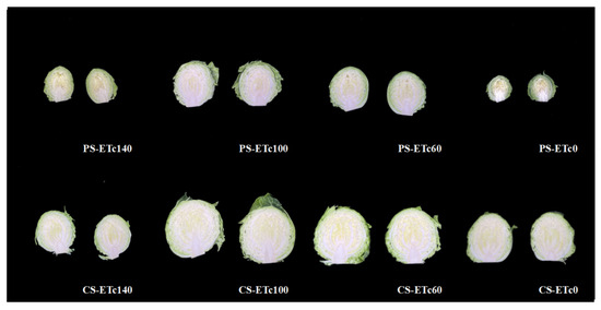 The yield and growth traits of cabbage were significantly affected by both growth substrate and irrigation depth (Table 6). Overall, cabbage grown in CS exhibited significantly higher head diameter, fresh weight, dry weight, total yield, and water use efficiency (WUE) compared with PS. When comparing irrigation depth independently, no significant differences were observed among them. Within the PS treatments, the effect of irrigation depth on yield and growth traits was minimal, with PS-ETc100 showing a slight advantage over the other treatments. In contrast, within the CS treatments, both CS-ETc100 and CS-ETc60 increased head diameter, fresh and dry weight, compared with CS-ETc140 and CS-ETc0. Correspondingly, total yield followed a similar trend, with CS-ETc100 achieving the highest yield and CS-ETc60 slightly less, although no significant difference was observed between them. WUE was also significantly influenced by both growth substrates and irrigation depth. The highest WUE was observed in CS-ETc60, followed by CS-ETc100, suggesting that moderate deficit irrigation under CS conditions was beneficial for optimizing water use. In contrast, WUE in PS remained relatively low and showed no significant differences among irrigation depths. Additionally, the interaction between growth substrates and irrigation depths significantly affected all yield and growth traits, indicating that cabbage responses to irrigation strategies differed by root-zone conditions. These results suggest that irrigation optimization strategies should be adapted to the specific characteristics of the growth substrates. Morphological observations in Figure 8 showed that cabbage heads grown in CS-ETc100 and CS-ETc60 were not only larger but also firmer. Therefore, future crop management should optimize irrigation by considering both the dynamic water requirements of plants and the properties of the growth substrate, aiming to maximize yield and water use efficiency.