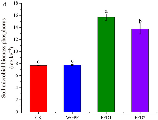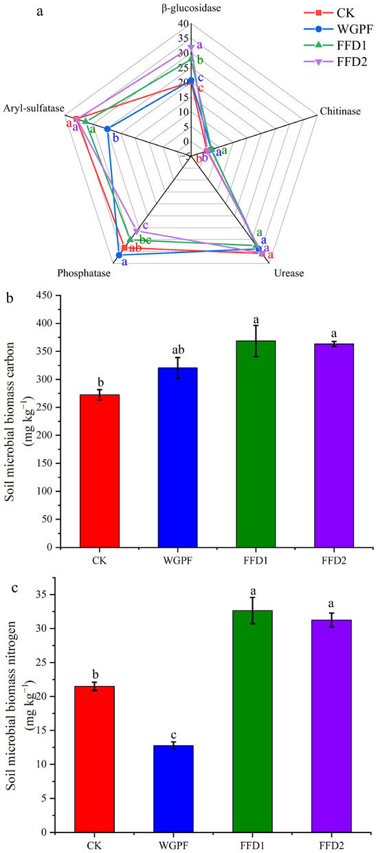 Soil enzyme activity and soil microbial activity in each treatment. (a) Soil enzyme activity; (b) soil microbial biomass carbon; (c) soil microbial biomass nitrogen; (d) soil microbial biomass phosphorus. CK, control; WGPF, whole growing period flooding alone; FFD1, flooding and low-density cultured fish; FFD2, flooding and high-density cultured fish. Different letters indicate significant difference (p < 0.05).