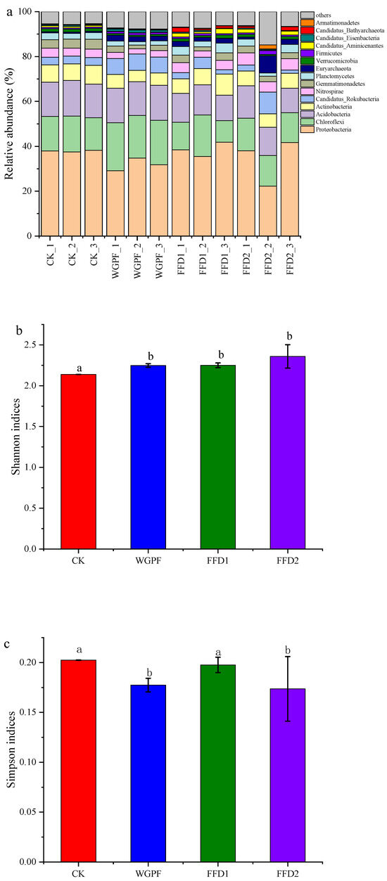 Soil microbial community structure and soil microbial diversity index in each treatment. (a) Soil microbial community structure; (b) Shannon indices; (c) Simpson indices; CK, control; WGPF, whole growing period flooding alone; FFD1, flooding and low-density cultured fish; FFD2, flooding and high-density cultured fish. Different letters indicate significant difference (p < 0.05).