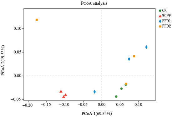 Two-dimensional PCoA plots revealing the community structures. CK, control; WGPF, whole growing period flooding alone; FFD1, flooding and low-density cultured fish; FFD2, flooding and high-density cultured fish.