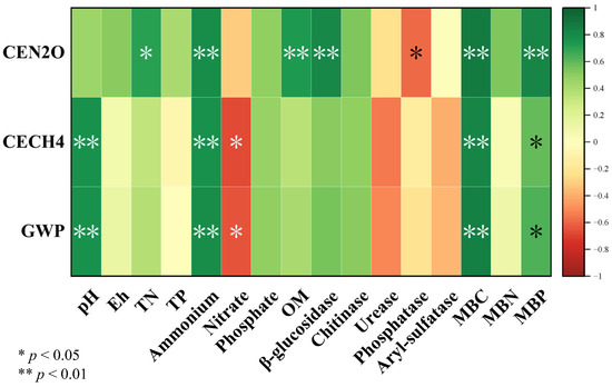 Pearson’s correlation analyses of the relationships among the soil physicochemical properties, enzyme activities, and microbial activity. TN, total nitrogen; TP, total phosphorus; NH4+, ammonium; NO3−, nitrate; PO3−, phosphate; OM, organic matter; MBC, soil microbial biomass carbon; MBN, soil microbial biomass nitrogen; MBP, soil microbial biomass phosphorus; CEN2O, cumulative nitrous oxide emissions; CECH4, cumulative methane emissions; GWP, global warming potential.