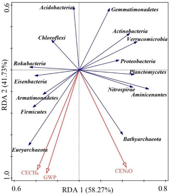 The linear correlations among soil physicochemical properties, greenhouse gas emissions, and microbial activities are illustrated in Figure 4. Cumulative nitrous oxide emissions were positively correlated with soil TN, NH4+, OM, β-glucosidase activities, MBC, and MBP, while negatively correlated with soil phosphatase activities. Cumulative methane emissions and GWP were positively correlated with soil pH, NH4+, MBC, and MBP, but negatively correlated with soil NO3−. Redundancy analysis (RDA) provided insights into the relationships between soil microbes and greenhouse gas emissions. The results of RDA shown that CEN2O was significantly and positively correlated with Bathyarchaeota, Nitrospirae, Aminicenantes, and Planctomycetes. CECH4 was significantly and positively correlated with Euryarchaeota, Firmicutes, Armatimonadetes, and Eisenbacteria (Figure 5). The Partial Least Squares Path Model (PLS-PM) revealed direct effects of the OM concentration and absolute abundances of methanogenic genes on cumulative methane emissions, while the NO3− concentration had a direct effect on cumulative nitrous oxide emissions (Figure 6).