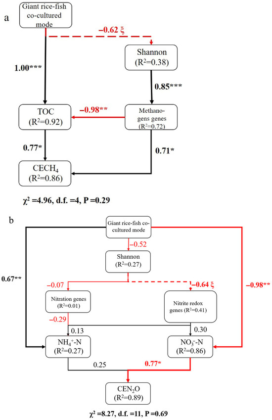 Structural equation model (SEM). The effect of planting and breeding modes, nutrients, and microbial factors on (a) methane cumulative emissions and (b) cumulative emission of nitrous oxide. Arrows represent the flow of causality among parameters. Arrow width is proportional to the standardized path coefficients and can be interpreted as the relative importance of each factor. Dashed arrows represent marginally significant relationships, black arrows represent positive linear relationships, and red arrows represent negative linear relationships. * p < 0.05; ** p < 0.01; *** p < 0.001; ξ p < 0.1.