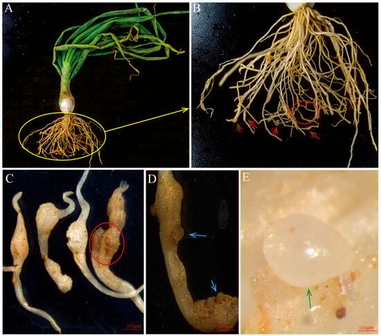 Disease symptoms of Allium cepa infected by RKNs. (A): Aboveground symptoms of Allium cepa infected by RKNs. (B–E): Belowground symptoms of Allium cepa infected by RKNs. In the images, yellow circles indicate infected root, red circles indicate necrotic root rot lesions, red arrows indicate root galls, blue arrows denote egg masses of RKNs, and green arrows point to female RKNs.