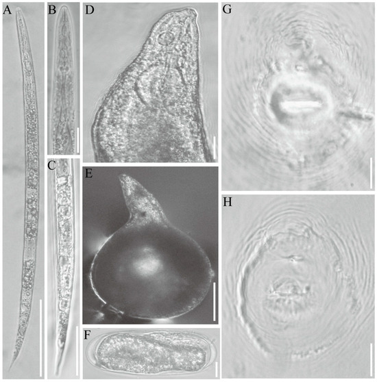 Morphological characteristics of the pathogen causing RKN disease in Allium cepa. (A): Whole body of J2. (B): Anterior region of J2. (C): Tail region of J2. (D): Anterior region of female. (E): Whole body of female. (F): Egg. (G,H): Perineal pattern morphology of females. (Scale bars: (A) = 100 μm; (B–D), (F–H) = 20 μm; (E) = 200 μm).