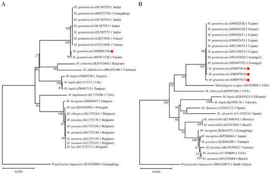 Molecular identification was performed via the amplification and sequencing of a 413 bp fragment from the mtDNA COXI region (GenBank accession number: OR889158). The sequence exhibited 99.51–100% similarity with the reported reference sequences of M. graminicola (including MN017128 and OL587534 (India), OL587542 (India), OL587557 (India), LR215856 (France), LR215858 (France), MZ522756 (Guangdong, China), and MN017128 (Fujian, China)). Phylogenetic analysis based on 24 sequences showed that the RKNs isolated from the onion samples formed an evolutionary branch with 100% support that was closely related to the aforementioned M. graminicola reference sequences and significantly diverged from other groups (Figure 3A). A 767 bp fragment from the 28S rDNA D2-D3 region (GenBank accession numbers: OR897813-OR897815) was also obtained, and its sequence exhibited 99.48–99.61% similarity with known M. graminicola reference sequences (ON032628 (Fujian, China), ON032631 (Fujian, China), ON032633 (Fujian, China), MZ656128 (Hunan, China), MT159673 (Fujian, China), MT159675 (Fujian, China), MN513029 (Guangdong, China), MN647592 (Guangdong, China), etc.). Phylogenetic analysis based on 28 sequences revealed that the RKN sequences from the onion samples formed an independent evolutionary branch with high support (100%) that was closely related to the aforementioned M. graminicola reference sequences (Figure 3B). Molecular identification results indicate that the pathogen causing onion RKN disease is M. graminicola.