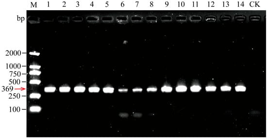 The use of the M. graminicola-specific primers Mg-F/Mg-R successfully amplified a specific band of 369 bp in all 14 onion RKN disease samples. This band size was consistent with the M. graminicola PCR amplification band reported in the existing literature, further confirming that the RKN pathogen infecting the 14 onion samples was M. graminicola (Figure 4).