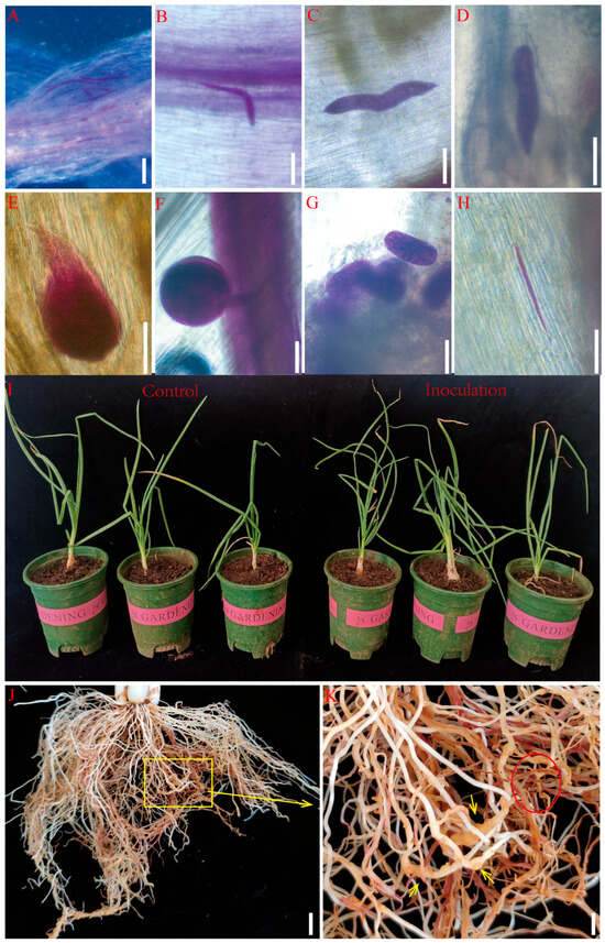 Different stages of Meloidogyne graminicola in Allium cepa. (A): J2s at 2 days after inoculation; (B): J2s at 4 days after inoculation; (C): J3s at 6 days after inoculation; (D): J4s at 12 days after inoculation; (E): immature Female at 18 days after inoculation; (F): Female at 22 days after inoculation; (G): Eggs at 26 days after inoculation; (H): J2s of the next generation, which infect A. cepa at 26 days after inoculation; (I): A. cepa seedlings 26 days after inoculation with M. graminicola; (J,K): Root symptoms of A. cepa at 26 days after inoculation (The yellow box indicates the magnified section, the red circle highlights the root necrosis area, and the yellow arrow points to the root knot.). Staining method: Acid fuchsin staining. Scale bars: (A,E,F) = 200 μm; (B–D,H) = 100 μm; (G) = 50 μm; (J) = 5 mm; (K) = 2.5 mm.