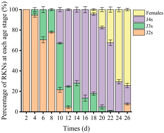 Development process of the RKNs in Allium cepa. J2s: Second-stage juveniles; J3s: Third-stage juveniles; J4s: Fourth-stage juveniles. Three pots were sampled each time.