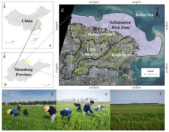 The Yellow River Delta (E 118°40′–E 120°20′, N 37°25′–N 38°00′) is located in Eastern China, adjacent to the Bohai Sea at the estuary of the Yellow River Basin. Administered by Dongying City, Shandong Province, this region spans approximately 5450 square kilometers and features a temperate monsoon climate with flat topography, where elevation gradually declines from the Yellow River coastline to the surrounding areas. The dominant soils are coastal saline and alkaline types, and the agro-ecosystem is mainly composed of wheat, maize, and cotton, with natural vegetation such as reed and seepweed. Due to factors, such as shallow groundwater tables, seawater intrusion, groundwater contamination, and high rates of soil evaporation, the region experiences severe secondary salinization []. More than 80% of the cultivated land in the Yellow River Delta is affected by salinization, and soil salinity levels in some areas exceed 4 dS/m, classifying them as moderately to severely saline soils. This salinization has led to reduced crop vigor and increased mortality, resulting in low agricultural yields that hinder local agricultural development, exacerbate ecological degradation, and threaten regional security. This study focuses on a representative coastal saline–alkaline zone within the Yellow River Delta, specifically the Kenli District, Hekou District, and Lijin County in Shandong Province. The widespread and varying levels of salinization in this area make it an ideal research region, as illustrated in Figure 1.