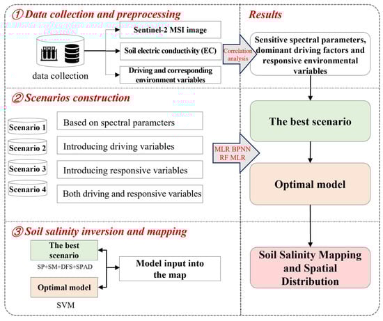 Initially, we examine sensitive spectral parameters related to soil salinity and determine the dominant environmental variables. Subsequently, these variables are then incorporated to build the inversion models from four scenarios: Scenario 1—spectral parameters only; Scenario 2—spectral parameters combined with driving variables; Scenario 3—spectral parameters combined with response variables; and Scenario 4—spectral parameters combined with both driving and response variables. Various modeling methods, including multiple linear regression (MLR) and Backpropagation Neural Network (BPNN), are employed. The performance and robustness of the different models are compared to determine the optimal model, with the aim of achieving accurate inversion and spatial distribution analysis of soil salinity in the Yellow River Delta. This study aims to identify the dominant driving and response variables affecting soil salinization and incorporate them to enhance the accuracy of soil salinity remote sensing inversion.