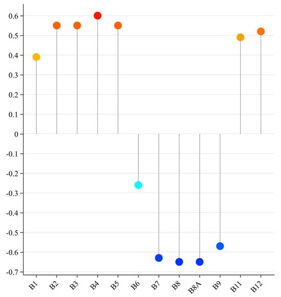 The correlation coefficients between EC and the single-band reflectance of Sentinel-2 MSI imagery range from −0.65 to 0.60, indicating generally strong associations. Specifically, bands B6, B7, B8, B8A, and B9 exhibited negative correlations, whereas the remaining bands showed positive correlations (see Figure 3). Based on the strength of these correlations and previous studies [], bands with correlation coefficients greater than 0.55 or less than −0.65 are identified as sensitive bands for soil salinity. These included bands B2, B3, B4, B5, B8, and B8A.