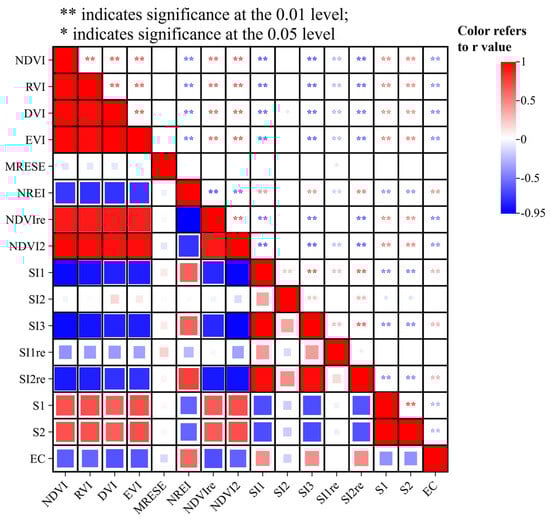 To address multicollinearity and enhance model stability and interpretability, Variance Inflation Factor (VIF) analysis was conducted. VIF is a common diagnostic tool to detect multivariate collinearity. Indices with VIF values exceeding 5 were excluded to reduce redundancy and prevent overfitting []. Following this filtering, the final set of indices included DVI, EVI, NREI, and NDVIre, which exhibited both strong correlations with EC and acceptable multicollinearity levels.