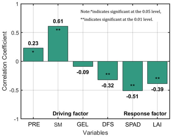 The correlation between EC and four driving factors—PRE, SM, GEL, and DFS—as well as two response variables—SPAD and LAI—is illustrated in Figure 5. The absolute values of the correlation coefficients for these six factors range from 0.09 to 0.61. Among them, four factors, excluding PRE and GEL, demonstrate strong correlation with soil salinity and pass the significance test. Specifically, SM shows the highest correlation coefficient at 0.61, followed by DFS with a coefficient of −0.32. PRE and GEL show weaker correlations, with absolute values below 0.3. Both response variables also display strong correlations with soil salinity, with SPAD at −0.51 and LAI at −0.39.