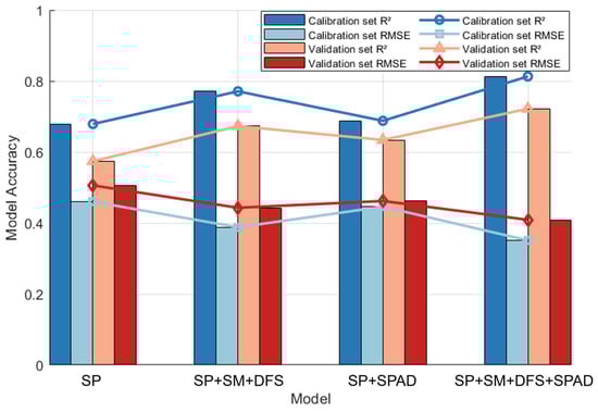 When SM was combined with SP, the calibration set R2 values ranged from 0.637 to 0.696, with RMSE between 0.430 and 0.470. For the validation set, R2 values ranged from 0.601 to 0.653, and RMSE values ranged from 0.492 to 0.527. When DFS was combined with SP, the calibration set R2 values ranged from 0.623 to 0.667, with RMSE values ranging from 0.458 to 0.508. For the validation set, R2 values ranged from 0.628 to 0.656, and RMSE values ranged from 0.473 to 0.506. When both SM and DFS were integrated with SP, the model’s calibration set R2 values ranged from 0.691 to 0.771, with RMSE values between 0.388 and 0.434. For the validation set, R2 values ranged from 0.643 to 0.729, and RMSE values ranged from 0.407 to 0.498.