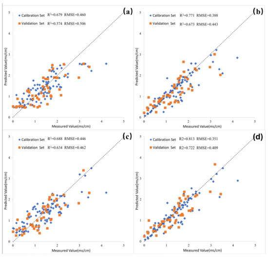 Soil salinity inversion models were developed using four different algorithms, utilizing only the selected sensitive spectral parameters (SPs). The results are summarized in Table 4. Overall, the models exhibited moderate predictive capability, with R2 values ranging from 0.573 to 0.679 and RMSE values between 0.460 and 0.530 for the calibration set. For the validation set, R2 values ranged from 0.567 to 0.579, and RMSE values were between 0.506 and 0.513. Although these models based solely on spectral parameters were able to quantitatively estimate soil salinity, validation R2 values below 0.6 suggest that their robustness remains limited.