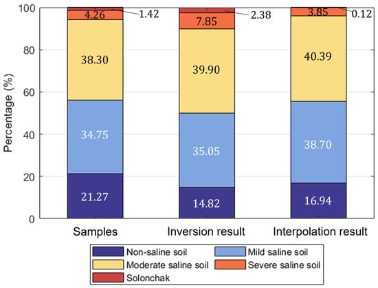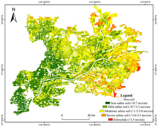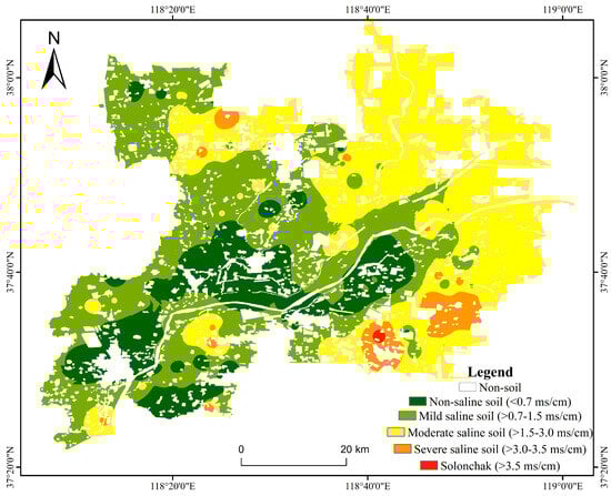 Using Sentinel-2 MSI imagery, environmental variable data, and the optimal model, soil salinity inversion for the study area was conducted with MATLAB 2021a software to generate a spatially explicit regional soil salinity map. Based on previous research and coastal sodium chloride-type soil salinization classification standards [], the inversion results were categorized into five levels, non-saline soil (<0.7 ms/cm), mild saline soil (0.7–1.5 ms/cm), moderate saline soil (1.5–3.0 ms/cm), severe saline soil (3.0–3.5 ms/cm), and solonchak (>3.5 ms/cm), creating a regional soil salinity classification map. Additionally, soil salinity at sampling points was interpolated using the inverse distance weighting method and compared with the inversion results to assess model accuracy.