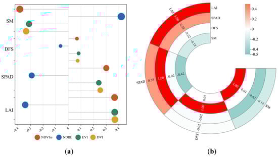 In Scenario 3, model accuracy ranks from high to low as follows: SP + SPAD > SP + SPAD + LAI > SP + LAI. SPAD directly reflects chlorophyll content, which is highly sensitive to salt stress, with a correlation coefficient of −0.51 relative to soil salinity. For example, Shah et al. demonstrated that under salt stress, chlorophyll content often decreases, enabling SPAD to effectively capture the direct effects of salinity on plant physiological conditions []. Furthermore, as shown in Figure 11a, the absolute correlation coefficient between SPAD and SPs remains relatively low (all below 0.3), indicating that including both spectral data and SPAD in the model does not introduce data redundancy, thereby effectively improving model accuracy. In contrast, LAI reflects vegetation coverage or leaf growth, which has a weaker correlation with soil salinity. Xu et al. found that LAI is influenced by various factors and is less sensitive to salinity, so incorporating LAI alone contributes minimally to model accuracy []. Additionally, the absolute correlation between LAI and SPs is relatively high, ranging from 0.36 to 0.37, suggesting that LAI provides limited independent information. This aligns with findings from Darvishzadeh et al., who demonstrated a strong correlation between LAI and vegetation spectral information, achieving high-accuracy LAI estimations using five vegetation spectral indices []. Therefore, including LAI alone does not significantly enhance model performance. As both SPAD and LAI are included, the primary effects of salinity are already captured by SPAD, making LAI’s contribution relatively minor, thus limiting any further improvement in model accuracy []. Additionally, Figure 11b shows that the correlation coefficient between SPAD and LAI is as high as 0.375, indicating a degree of information overlap. This redundancy increases model complexity and may lead to overfitting, potentially constraining improvements in predictive accuracy. Kulig et al. also reported a strong correlation between LAI and SPAD across various cultivation systems [].