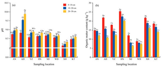 Soil properties at different soil layers under distribution area of E. minor in Gansu Province. (a) The soil pH under various E. minor sites; and (b) soil OM under different E. minor sites. AN: Lanzhou Anning; AD: Dingxi Anding; YZ: Lanzhou Yuzhong; HN: Baiyin Huining; MJ: Tianshui Maiji; WD: Longnan Wudu; XH: Longnan Xihe; KT: Pingliang Kongtong. Vertical error bars signify the corresponding standard error of mean values; n = 3. Capital letters indicate significant differences between E. minor sampling sites in the same soil layer (p < 0.05) whilst lowercase letters display significant differences between different soil strata in the sampling sites (p < 0.05). Significant differences were determined by Duncan’s test.