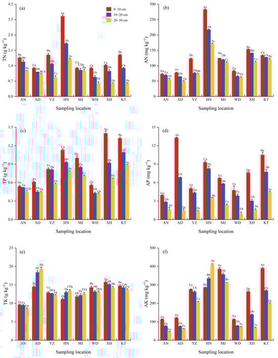Soil nutrients under E. minor distribution sites in Gansu Province at various soil depths. (a–f) are the soil total nitrogen, available nitrogen, total phosphorous, available phosphorous, total potassium, and available potassium under various E. minor sites. AN: Lanzhou Anning; AD: Dingxi Anding; YZ: Lanzhou Yuzhong; HN: Baiyin Huining; MJ: Tianshui Maiji; WD: Longnan Wudu; XH: Longnan Xihe; KT: Pingliang Kongtong. Vertical error bars show the corresponding standard error of mean values; n = 3. Capital letters indicate significant differences between E. minor sampling sites in the similar soil depth (p < 0.05) whilst lowercase letters display significant differences between different soil strata in the sampling sites (p < 0.05). Significant differences were determined by Duncan’s test.