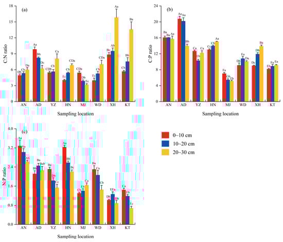Soil stoichiometric ratios under E. minor distribution sites in Gansu Province at different soil layers. (a–c) are the C:N ratio, C:P ratio and N:P ratio under various E. minor sites. AN: Lanzhou Anning; AD: Dingxi Anding; YZ: Lanzhou Yuzhong; HN: Baiyin Huining; MJ: Tianshui Maiji; WD: Longnan Wudu; XH: Longnan Xihe; KT: Pingliang Kongtong. Vertical error bars show the corresponding standard error of mean values; n = 3. Capital letters indicate significant differences between E. minor sampling sites in the same soil layer (p < 0.05) whilst lowercase letters display significant differences between different soil strata in the sampling sites (p < 0.05). Significant differences were determined by Duncan’s test.