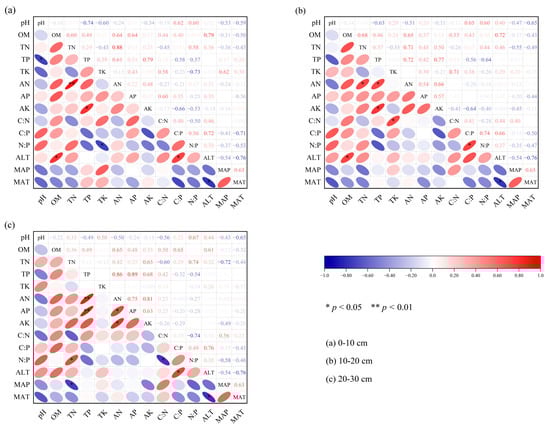 Pearson correlation analysis was conducted to explore the relationships between soil indicators, stoichiometric ratios, and environmental factors (altitude, precipitation, and arial temperature) at various soil layers (Figure 5a–c). In the 0–10 cm and 10–20 cm soil layers, soil OM content showed significant positive correlation with altitude (p < 0.05), and soil TP content was significantly positively correlated with soil AK content. The positive correlation between soil TN content and AN content weakened with soil depth, being extremely significant in the 0–10 cm layer at p < 0.01) but only significant in the 10–20 cm layer at (p < 0.05). Soil pH and soil TP content showed a significant negative correlation in the 0–10 cm soil layer (p < 0.05) but were not significantly correlated in the 10–20 cm and 20–30 cm soil layers (p > 0.05). The soil C:P ratio was significantly positively correlated with altitude in the 0–10 cm and 20–30 cm soil layers (p < 0.05). The soil N:P ratio showed a significant positive correlation with TN content in the 20–30 cm soil layer (p < 0.05). In the 20–30 cm soil layer, the soil N:P ratio was significantly positively correlated with TN content and negatively correlated with soil C:N ratio (p < 0.05) (Figure 5c).