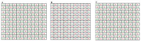Schematic of greenhouse cultivation for two-species or three-species systems. (A): M. micrantha intercropped with A. argyi or P. oleracea (1:1); (B): M. micrantha with A. argyi and P. oleracea (2:1:1); (C): M. micrantha with A. argyi and P. oleracea or M. micrantha with P. oleracea and A. argyi (3:1:2). Mm = M. micrantha, Aa = A. argyi, Po = P. oleracea.