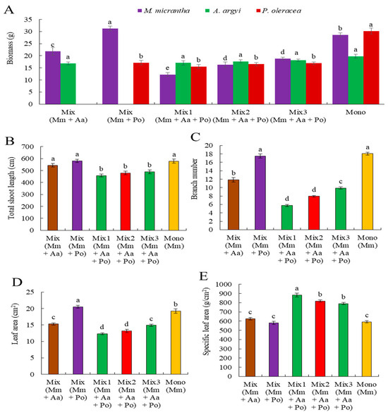Effects of different plant competitors (A. argyi and P. oleracea) on the growth of M. micrantha in greenhouse experiments. Mix (Mm + Aa) and Mix (Mm + Po) indicate equal-proportion mixed cultivation of M. micrantha with A. argyi or P. oleracea. Mix1, Mix2, and Mix3 indicate ratios of M. micrantha, A. argyi, and P. oleracea of 3:2:1, 2:1:1, and 3:1:2, respectively. Mono denotes monoculture of M. micrantha. (A): Biomass of M. micrantha, A. argyi, and P. oleracea under different cultivation conditions; (B): Total shoot length of M. micrantha; (C): Branch number of M. micrantha; (D): Leaf area of M. micrantha; (E): Specific leaf area of M. micrantha. Different letters indicate significant differences (p < 0.05).