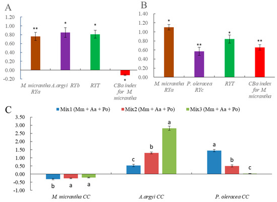 Relative yield (RY), relative yield total (RYT), competitive balance index (CB), and change in contribution (CC) of M. micrantha, A. argyi, and P. oleracea under mono- and mixed-culture conditions. Treatments included 1:1 ratios of M. micrantha to A. argyi (A) and M. micrantha to P. oleracea (B). Change in contribution (CC) of M. micrantha when cocultivated with A. argyi and P. oleracea under mixed culture conditions. Mix1, Mix2, and Mix3 represent mixed planting ratios of 3:2:1, 2:1:1, and 3:1:2 (M. micrantha–A. argyi–P. oleracea), respectively (C). The t-test was used to compare relative yield (RY), relative yield total (RYT) with 1.0, and competitive balance index (CB) with 0. * and ** respectively indicate significant differences at the 0.05 and 0.01 level. Different letters signify significant differences at p < 0.05.