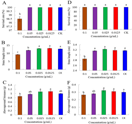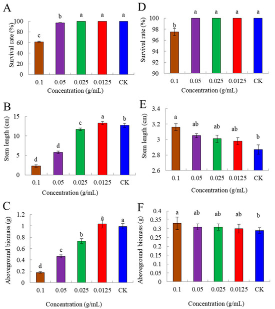 The effects of different concentrations of P. oleracea aqueous extract on the growth of M. micrantha and A. argyi seedlings. (A): survival rate of M. micrantha, (B): stem length of M. micrantha, (C): aboveground biomass of M. micrantha, (D): survival rate of A. argyi, (E): stem length of A. argyi, and (F): aboveground biomass of A. argyi. Different lowercase letters indicate significant differences (p < 0.05).