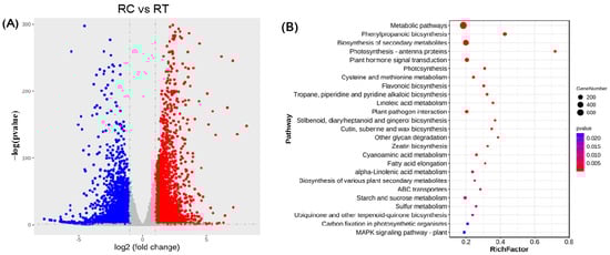 Analysis of gene expression levels and KEGG enrichment. (A): RC: SCN-resistant control; RT: resistant SCN treatment group; and RC vs. RT: volcano plot of differentially expressed genes between the control group of Dongnong L10 and the treatment group of Dongnong L10; The down-regulated genes are presented in blue, the up-regulated genes are presented in red, and the non-differentially expressed genes are presented in gray. (B): KEGG enrichment of 25 pathways for the differentially expressed genes. p value: 0.005–0.02, p < 0.001 extremely significant; p < 0.05 significant; Gene Number: The size of the sphere represents the number of enriched genes: the larger the sphere, the more enriched genes there are. The enrichment range is 200–600.