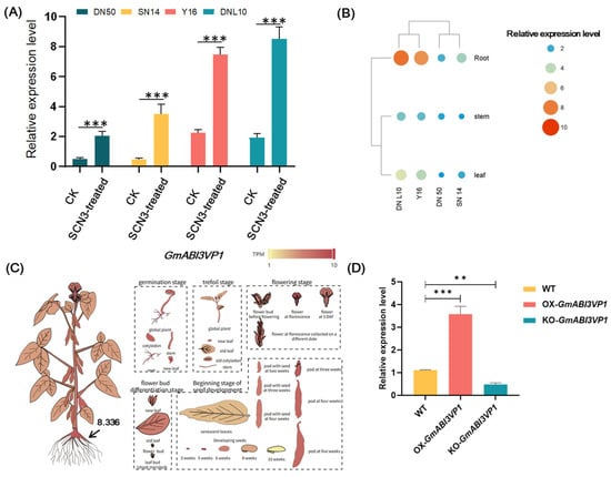 Analysis of the relative expression levels in soybean roots under SCN 3 stress. (A): Four soybean materials, including two extremely resistant to SCN 3 (Dongnong L10, Y 16) and two extremely sensitive to SCN 3 (Dongnong 50, SN 14), were chosen to be subjected to SCN 3 stress as the treatment groups. Meanwhile, the four resistant and susceptible soybeans without SCN 3 stress treatment were regarded as the control groups; CK: Soybean plants without SCN 3 stress treatment; (B): Results of qRT-PCR of GmABI3VP1 gene in different tissue parts of DN L10, Y16, DN50, and SN14 plants; Circle: relative expression level of the gene; the larger the circle, the higher the relative expression level; (C): TPM (1–10): Transcripts Per Kilobase of exon model per million mapped reads, 1–10 Relative expression level, The closer the color is to red, the higher the relative expression level; the closer the color is to yellow, the lower the relative expression level; (D): Analysis of GmABI3VP1 gene expression on different developmental structures; WT: Wild Type; OX-GmABI3VP1: Overexpression-GmABI3VP1; KO-GmABI3VP1: Knock Out-GmABI3VP1, *** p < 0.001, ** p < 0.01.