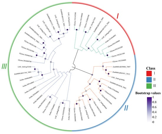 Phylogenetic tree analysis of the B3 DNA binding domain protein in soybean, maize, rice, and foxtail millet. This phylogenetic tree was constructed using the maximum likelihood method in the MEGA X software (ver. 10.2.6, Molecular Evolutionary Genetics Analysis Group, Tempe, AZ, USA). We selected 19, 9, 10, and 10 VP1/ABI3 transcription genes from soybean, maize, rice, and foxtail millet, respectively; Bootstrap values: Bootstrap values range from 0 to 1. The darker the color, the higher the bootstrap value, and the closer the genetic relationship.