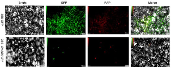 Subcellular Localization Analysis of the Protein Encoded by GmABI3VP1. Bright: Bright field; GFP: Green fluorescent protein field; RFP: Red fluorescent protein field; Merge: Merged field; 35S-GFP: Results of injecting tobacco with Agrobacterium tumefaciens GV3101 (p-soup19) carrying pCAMBIA1302-GFP; 35S-GmABI3VP1: Results of injecting tobacco with Agrobacterium tumefaciens GV3101 (p-soup19) transformed with the competent cells of pCAMBIA1302-GmABI3VP1.