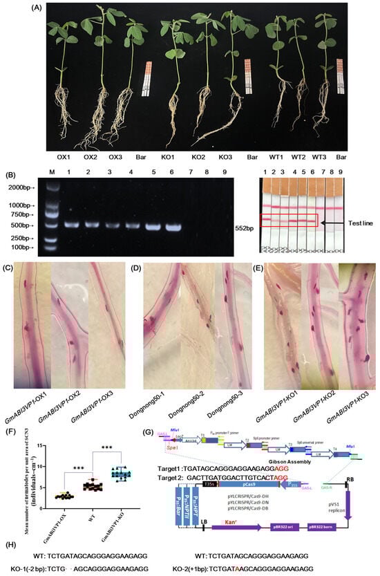 Results of SCN disease phenotype identification. “***”: p < 0.001; “#”: symbol to mark different DNA segments. (A): Roots of OX1–OX3 with overexpressed GmABI3VP1; Roots of KO1-KO3 with GmABI3VP1 edited by the pYLCRISPR/Cas9 gene; Wild-type Dongnong 50 soybeans of WT1–WT3. (B): M: DL2000 Marker; 1–3: PCR electrophoresis results of the BAR gene in the roots of OX1–3; 4–6: PCR electrophoresis results of the BAR gene in the roots of KO4–6; 7–9:WT; (C): GmABI3VP1-OX1–3: Phenotype identification of SCN in overexpressed roots; (D): WT roots: Phenotypic characterization of wild-type SCN; (E): GmABI3VP1-KO1–3: Phenotypic characterization of GmABI3VP1 Roots Edited with pYLCRISPR/Cas9 Gene; (F): Box plot of the identified number of SCN in GmABI3VP1-OX, GmABI3VP1 KO, and WT roots per unit area (per cm of lateral root length); (G): pYLCRISPR/Cas9 Basic plasmid backbone; (H): Information on the backbone and target sequences of the pYLCRISPR/Cas9 gene editing.