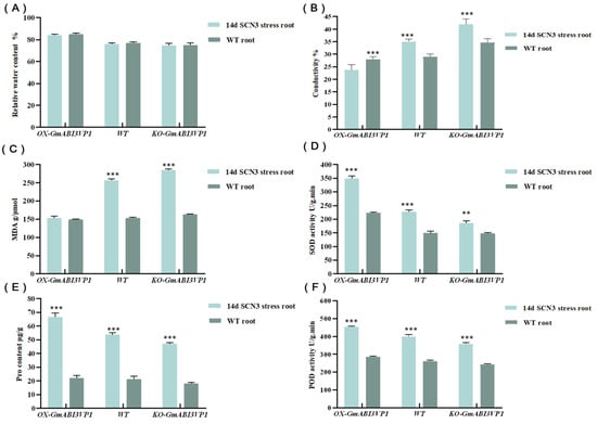 Determination of SCN 3 stress-related indices in transgenic root systems. (A): Determine the relative water content of OX-GmABI3VP1, WT (Dongnong 50), and KO-GmABI3VP1; (B): Determine the electrical conductivity of OX-GmABI3VP1, WT (Dongnong 50), and KO-GmABI3VP1; (C): Determine the MDA content of OX-GmABI3VP1, WT (Dongnong 50), and KO-GmABI3VP1; (D): Determine the SOD content of OX-GmABI3VP1, WT (Dongnong 50), and KO-GmABI3VP1; (E): Determine the content of proline synthase in OX-GmABI3VP1, WT (Dongnong 50), and KO-GmABI3VP1; (F): Determine the POD content of OX-GmABI3VP1, WT (Dongnong 50), and KO-GmABI3VP1, ** p < 0.01, *** p < 0.001.