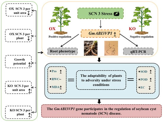 In this study, the Dongnong L10, which is resistant to SCN, and the Heinong 37, which is susceptible to SCN, were adopted. After being subjected to SCN 3 stress for 14 d, the root tissues were sent for RNA-Seq sequencing. The differentially expressed gene GmABI3VP1 was identified through transcriptome data (RNA-Seq) screening. Then, the overexpression recombinant plasmid pCAMBIA3300-GmABI3VP1, the subcellular localization recombinant plasmid pCAMBIA1302-GmABI3VP1, and the gene editing recombinant plasmid pYLCRISPR/Cas9-GmABI3VP1 were constructed. The successfully constructed recombinant plasmids were, respectively, transferred into the competent cells of Escherichia coli DH5α and Agrobacterium tumefaciens K599. Bioinformatics analysis was carried out on the GmABI3VP1 protein, including phosphorylation, secondary and tertiary structures of the protein, and promoter elements. It was shown by the results that multiple gene elements related to responding to adverse stress were contained in this gene, and the plant adverse stress was involved with them. It was also confirmed by the SCN phenotype identification that this gene was involved in resistance to SCN 3, and this gene was classified as a positive regulatory factor. It was preliminarily proved that obvious resistance to SCN 3 disease was possessed by the GmABI3VP1 gene (Figure 7).