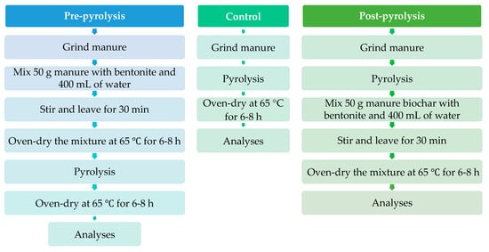 The manure, sourced from a local farmer in Chiang Mai, Thailand, was crushed and ground prior to pyrolysis. The experiment was conducted in February 2025 and included three distinct pyrolysis processes: control, pre-pyrolysis, and post-pyrolysis (Figure 1). For the control treatment, the ground manure was pyrolyzed at 550 °C for 1 h. This pyrolysis temperature was selected based on previous studies indicating that this temperature range is optimal for maximizing biochar yield while ensuring sufficient carbonization and stability of the biochar produced from manure-based feedstocks [,]. The resulting manure biochar was oven-dried at 65 °C for 6–8 h to ensure consistency in moisture content across all treatments and to remove any residual moisture that might have been absorbed during sample handling, cooling, or storage. In the pre-pyrolysis process, the ground manure was mixed with bentonite before undergoing pyrolysis. The bentonite (World Chemical Group, Chiang Mai, Thailand) consisted primarily of montmorillonite, with minor components such as feldspar, gypsum, calcium carbonate, and quartz. It had a pH of 10.6 ± 0.03, electrical conductivity of 1042 ± 5.00 µS/cm, and total dissolved solids of 0.521 ± 0.003 g L−1. Notably, its high swelling capacity, expanding to 5–20 times its dry volume, produces a gel-like consistency that enhances coating and adhesion to manure particles.