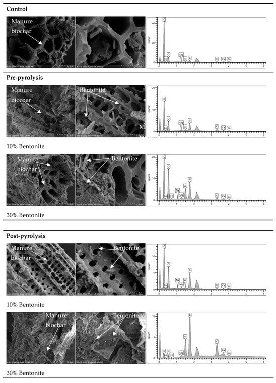 SEM images (Figure 2) show marked structural alterations in manure-derived biochar modified with 10% and 30% bentonite, both pre- and post-pyrolysis. In the control samples, the biochar displayed a typical highly porous structure—an inherent feature of pyrolyzed biomass—which facilitates nutrient retention and adsorption []. In the pre-pyrolysis treatments, 10% bentonite visibly adhered to the biochar matrix, imparting a granular appearance and partially filling the pores, while 30% bentonite incorporation led to a denser and rougher surface morphology. These changes are attributed to thermal interactions between bentonite and OM during pyrolysis, which may enhance structural integrity but reduce accessible pore space []. In the post-pyrolysis treatments, bentonite appeared to coat the external surfaces of the already formed biochar. At 10%, bentonite retained the porous framework while visibly embedding within the matrix, possibly buffering against pore collapse during thermal exposure. However, at 30%, the bentonite heavily coated or occluded the pores, leading to a notable decrease in visible porosity. This pore-filling effect may alter the biochar’s water retention and nutrient exchange potential, as excessive bentonite can limit internal surface area and hinder permeability [,].
